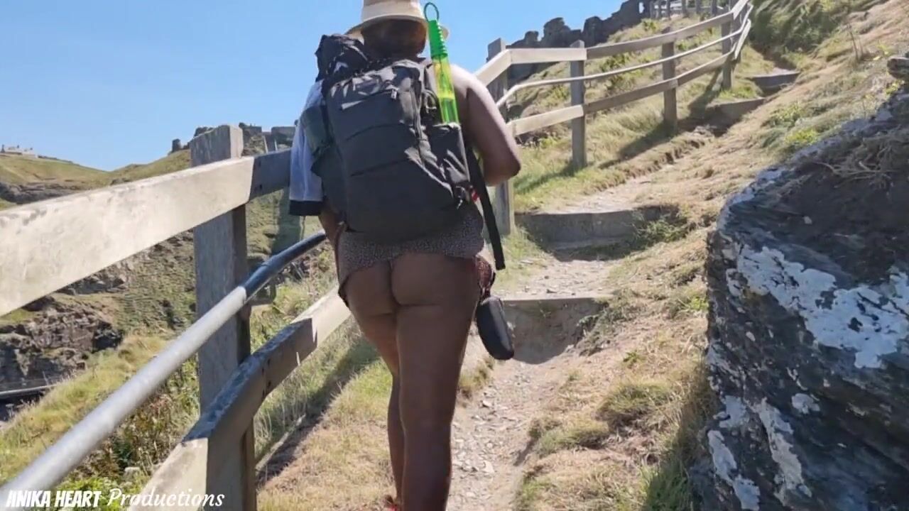MOUNTAIN HIKING SEXY GIRL'S SHORT DRESS CAUGHT IN BACKPACK EXPOSING HER BIG ASS - CANDID